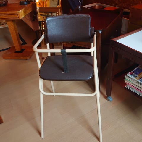 Jättefin ovanlig barnstol med sits i trä (ev. teak) och ben och rygg i metall.