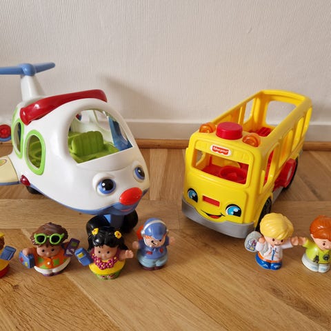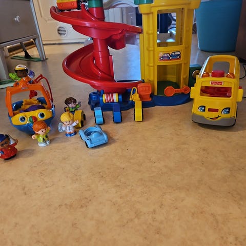Fisher-Price barnleksaker som inkluderar en bilbana med spiralramp i plast i färgerna röd, grön och gul samt en dragbil i trä med tre olika fordon. Leksakerna är avsedda för små barn och är tillverkade i plast och trä(enligt bilder)