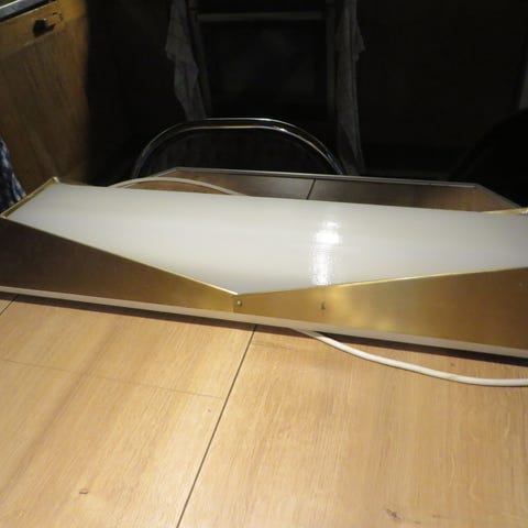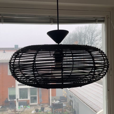 Taklampa typ majolika, med vit skärm stomme i gjutjärn och detaljer i mässing. Lampan är upphängd med kedja och har plats för tre ljus. Passar för användning i rum med klassisk inredning.