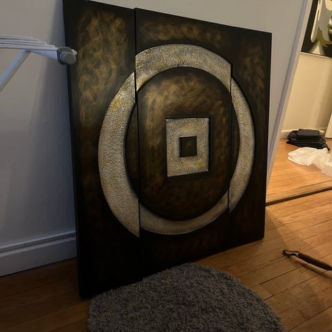 Connie O. Simonsen abstrakt konstverk i en rektangulär ram. Tavlan har en kombination av färger inklusive grå, orange och rosa med olika texturer och mönster. Passar för väggdekoration i hem eller kontor. Mäter 1,54m i bredd och 0,85 m i höjd.