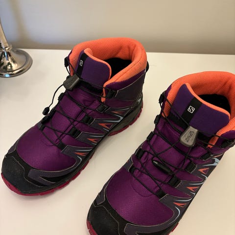 Salomon barnskor i storlek 34, små i storleken. Har en robust konstruktion lämplig för utomhusbruk. Gortex, inte mycket använda så fortfarande vattentäta. Perfekt vid vandring eller slask väder!
