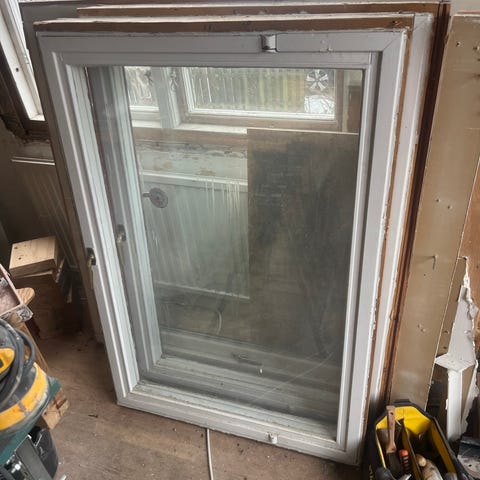 Fönster av okänt märke i vitt trä. Fyra stycken fönster med glas, lämpliga för installation i bostad eller byggprojekt. Fönstren är av standardstorlek och kan användas för att ersätta befintliga fönster eller i nybyggnation.