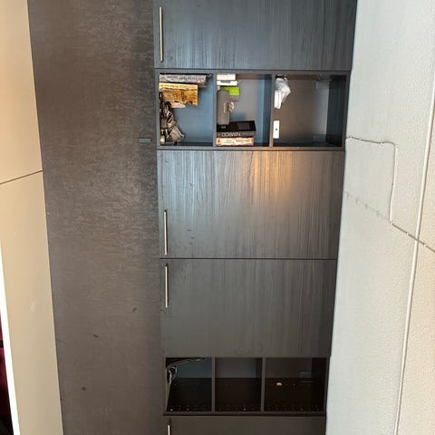 Stor förvaringshylla med vitrinskåp och barskåp bortskänkes. Varsamt använd /välvårdad. Flera defekta gångjärn i några av luckor och lådor, inga problem för den händige. Möbeln är isärskruvad i 3 under- och 3 överdelar samt en skiva 330 cm lång.