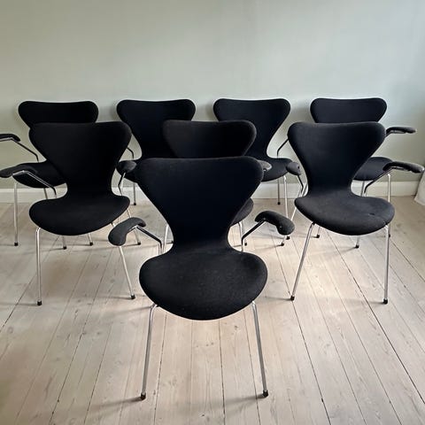 4 stycken Sjuan stolar från 60-talet. Sitthöjd på 41 cm. Ett par är lite spruckna i ryggen och färg är synligt avskavd. Säljes tillsammans för totalt 2500 kr