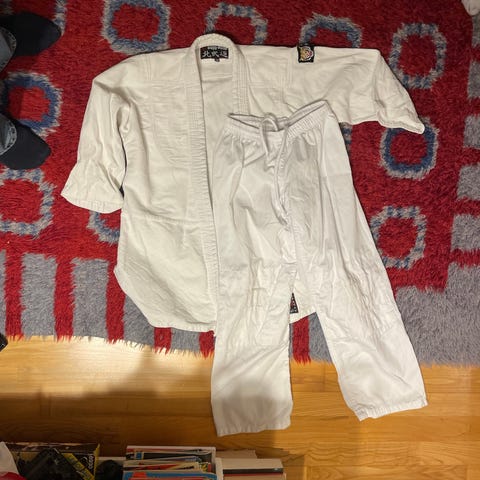 Budo-Nord Kampsportdräkt i barnstorlek 160, vit färg. Dräkten är avsedd för kampsport och består av jacka och byxor i ett slitstarkt material anpassat för träning och tävling. IKSU märket på jackan kan sprättas av innan frakt. Byxorna har blivit lagade på vänster knä