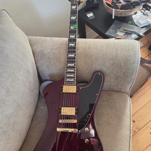 Signaturmodell åt Dan Jacobs från bandet Atreyu. Emg 81/85 och Floyd Rose 1000. Fint skick överlag. Färgen på Floydet är lite nött och det finns en mindre ding bak på kroppen. Banden är som nya. Säljes utan bag/case.