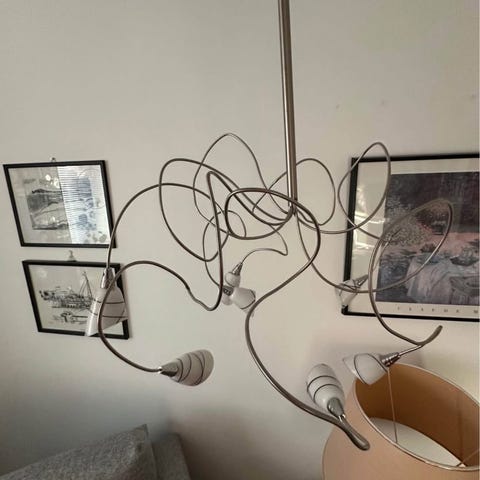 Stomme i kromat stål, med 12 ljusarmar, kupor i glas. Diameter ca 68 cm. Höjd ca 52 cm.