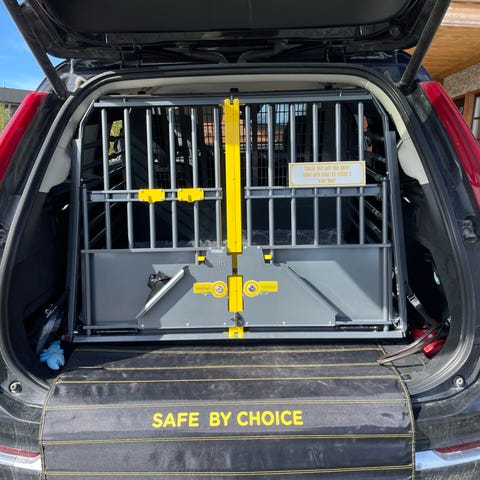Krocksäker bilbur. Höjd 59 cm, bredd 55,5 cm. Djup anpassas efter bilen 73-99 cm.