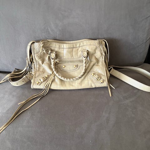 Balenciaga Axelremsväska i läder för kvinna. Väskan har en ljusgrön färg med krokodilstruktur och metallkedja som axelrem. Den är lämplig för vardagligt bruk och tillfällen där en mindre väska önskas.