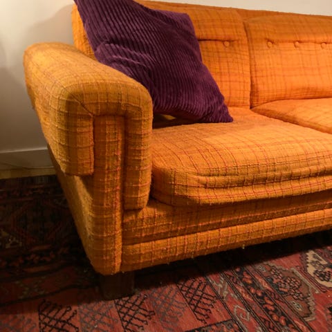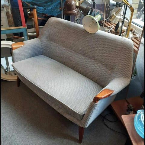 Löstagbara och tvättbara sitt- och ryggkuddar. Haft överdrag på sig. Resårbotten. Gedigen kvalitet och hantverk. Rygghöjd ca 85 cm. Sitthöjd: 48 cm.