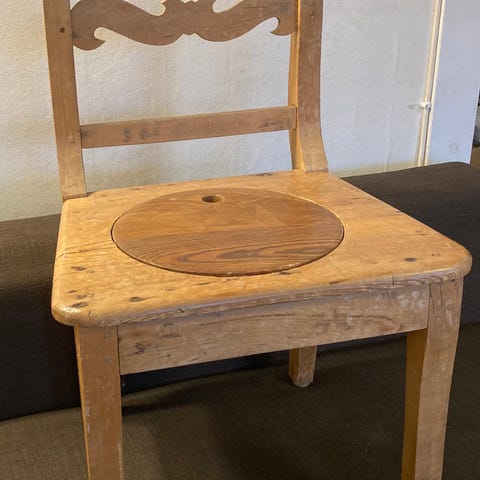 Antik stol med en träram och en broderad sits i tyg. Stolen har en dekorativ ryggstöd och böjda ben. Passar för användning som dekorativ möbel.