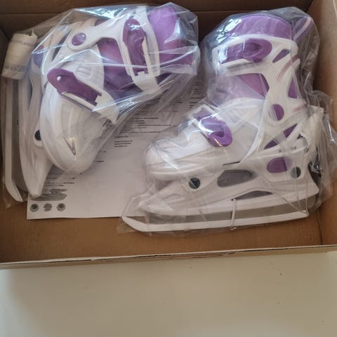 Barnskridskor med blå och svarta detaljer, anpassade för olika skridskosporter.