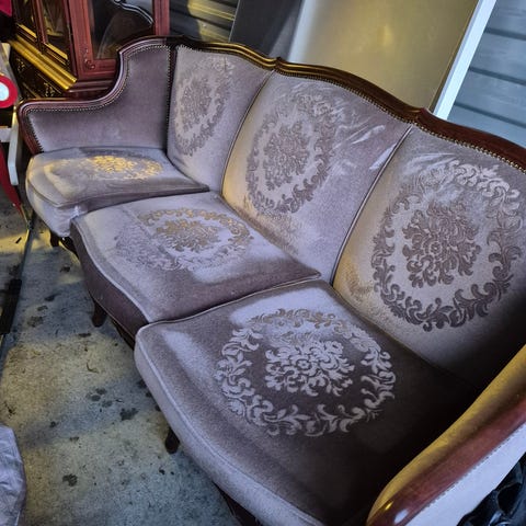 Soffa,2 fåtöljer och 1 bord. Tyg i ljusblå/grå .Lite gult högst upp på ryggstödet av solen. Hämtas I Djura.