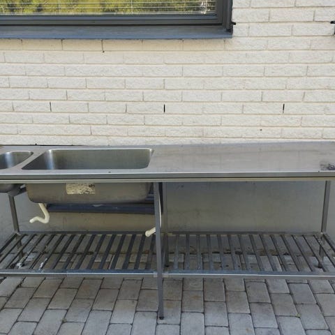 Diskbänk i rostfritt stål med flera förvaringsskåp och lådor. Passar för köksmiljö med behov av hållbar och lättskött arbetsyta och förvaring. Materialet rostfritt stål ger god motståndskraft mot korrosion och enkel rengöring.