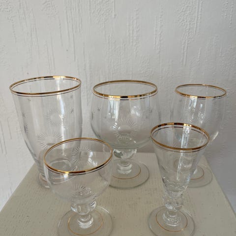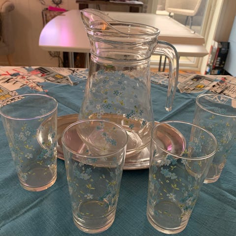 Handmålade glas 17 st, höjd 12,4 cm, diameter 7,4. Märkta ”Handmålat, Johansfors, Sweden”. Inköpta på 1950/60-talet. Mycket ovanliga. Bengt Orup?