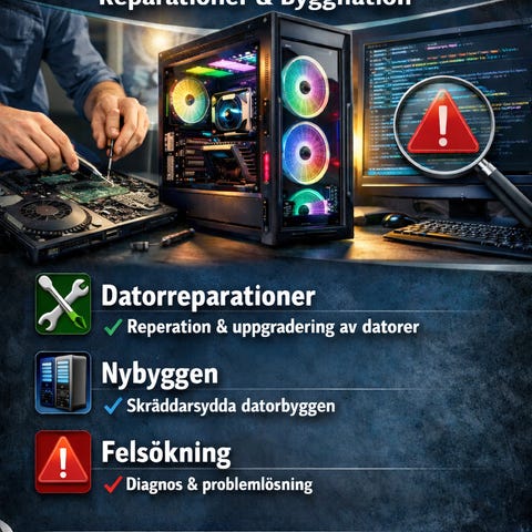 Hej! Julen nalkas och med det kommer allas favorit-julklappar. Och i år är det kanske dags att unna dig själv, partnern eller son/dotter en dator. Jag erbjuder rådgivning och byggnation - ensam eller tillsammans med din ungdom. Två presenter i en, kunskap och en sprillans ny dator!