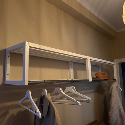 2 st stadiga vita hatthyllor med metallfästen. Ett skruvhål på den ena hyllan, annars helt ok, 150 kr för den hela, 100 kr för den med skruvhål.
