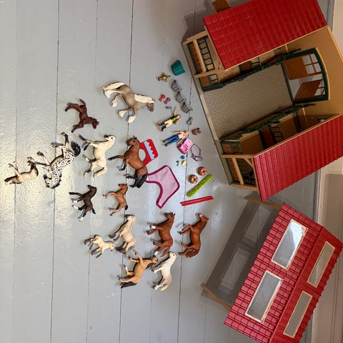 Hästgård, stall, spolspilta, ambulans, bil med hästsläp mm. Där finns massor med hästar, ryttare & andra djur med tillbehör. Allt i mycket fint skick.