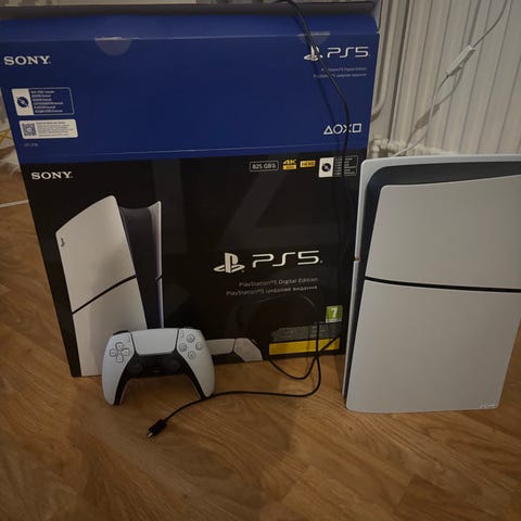 Sony PlayStation 5 Spelkonsol med 1TB lagringsutrymme i vit färg. Konsolen stödjer 4K-upplösning vid 120 Hz och HDR för förbättrad bildkvalitet. Diskfri modell med möjlighet att spela digitala spel via PlayStation Store. Inkluderar handkontroll och nödvändiga kablar.
