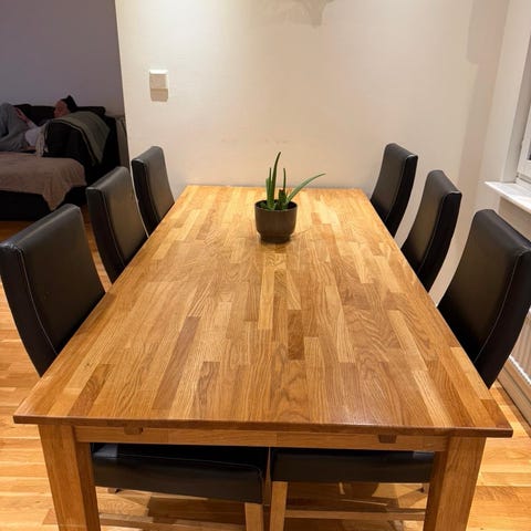 Matbordet är köpt från chili för ungefär ett år sedan och heter Uppveda, använt fåtal gånger därav säljer jag det nu, väldigt fint skick iomed att det nästan aldrig använts. 160cm men går att förlängas till 220cm. Org Pris 6000kr