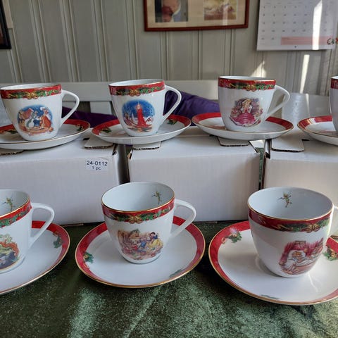 4 st porslinsmuggar, dekor under glasyr dvs. kan diskas i maskin. Lite slitningsskador i handmålade guldkanten. Volym 30cl.