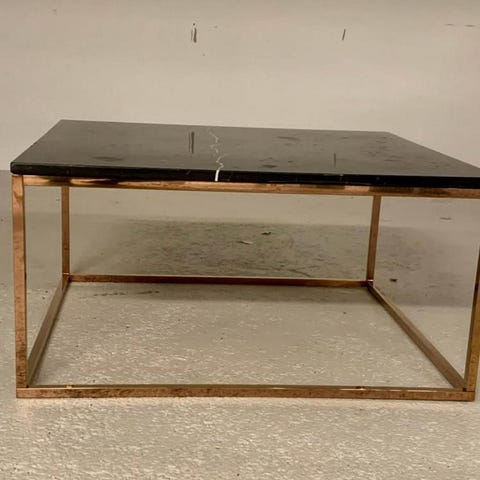 Runt soffbord med bordsskiva i brun marmor och bas i metall med guldig finish. Bordet har en stabil rund metallbas som stödjer marmorskivan. Passar som soffbord i vardagsrum eller liknande miljöer.