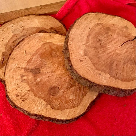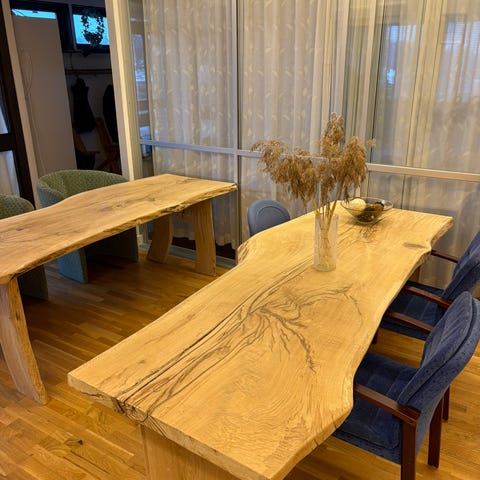 Ek/alm träskivor i obehandlat skick, lämplig för snickeri och möbelbygge. Storlek och tjocklek kan variera beroende på skiva.