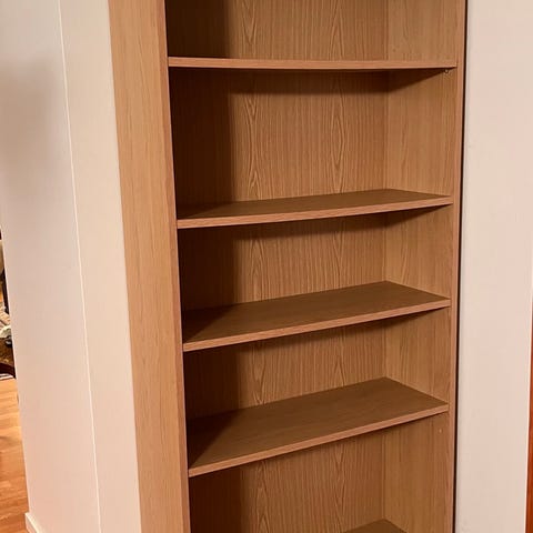 Väggmonterad bokhylla med flera hyllplan och vitrindel för visning av föremål. Inkluderar stängda förvaringsskåp längst ner. Passar för förvaring av böcker, prydnadsföremål och andra hushållsartiklar.