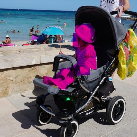 Har svängbara hjul fram och fullt liggläge. Handtaget är helt och fint. 🌸