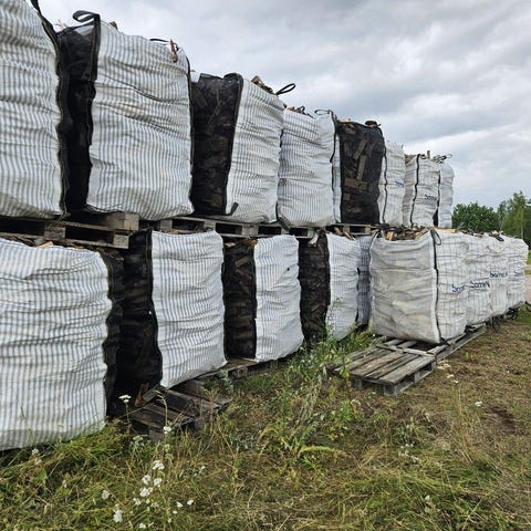Ved av björk i 1-kubikssäckar på returpall.