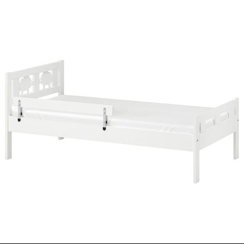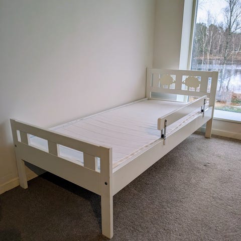 IKEA säng för barn. Praktisk sänglösning efter barnets spjälsäng. Tillverkad av material anpassade för barnrum. Finns madrass med skydd ifall man skulle vilja ha det. Finns avtagbar sidoskydd.