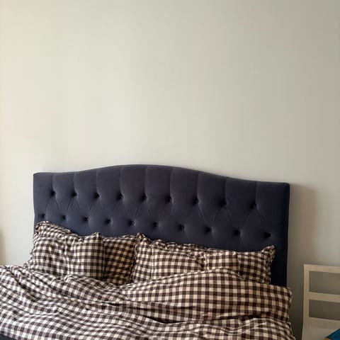 Mio sänggavel i ljusgrått tyg med knappar och rektangulär form. Står själv på 2 ben och behöver ingen montering.