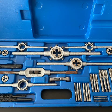Verktygssats innehållande olika storlekar av gängtappar och gängsnitt i metall. Satsen är förvarad i en blå plåtask och inkluderar även handtag och andra tillbehör för gängning. Verktygen är avsedda för bearbetning av metall och andra material där gängning krävs. M12, M16,M18,M20, 3/8, 1/2, 1/4...MM.
