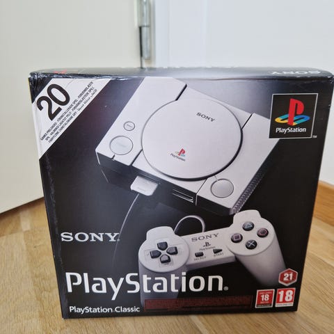 Sony PlayStation Classic spelkonsol i vit färg. Inkluderar originalkontroll och är en miniatyrversion av den ursprungliga PlayStation-konsolen. Kompatibel med PlayStation-spel och avsedd för retrospelupplevelse.