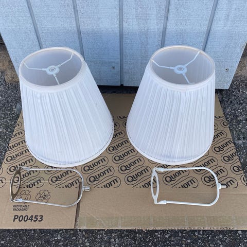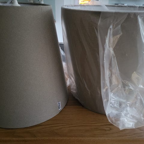 2 nya lampskärmar till bords/golvlampa. Gråa i filt/sammetsliknande material. Dekorativa nitar längst ner. Diameter övre 30, undre 34. 100 kr/styck