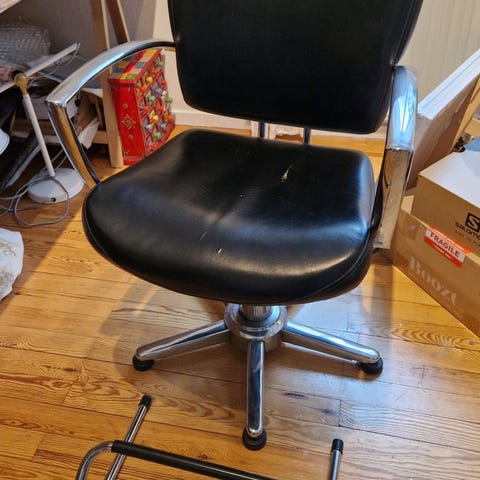 Frisörstolar som stått och använts i äldre damfrisering. Synligt använda med fin patina.