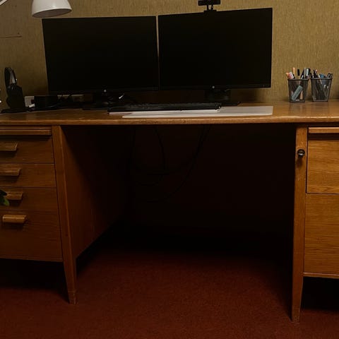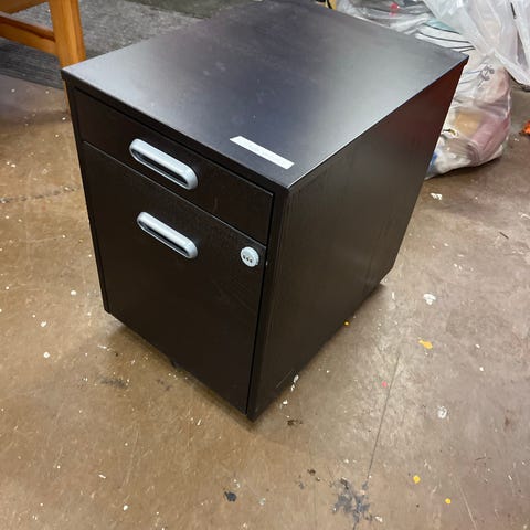 Träskrivbord med två skåp och en låda. Bordet har en klaff som kan fällas upp och är tillverkat i trä. Passar för användning som skrivbord eller arbetsyta.