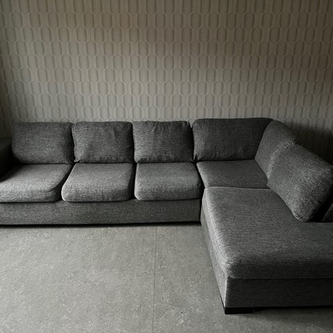 Fin mörkgrå schäslongsoffa säljes pga att den blev för liten för vårt nya vardagsrum.