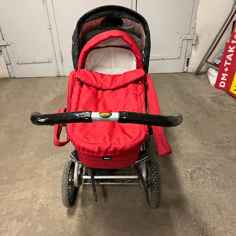 BRIO barnvagn i svart färg. Vagnen har ett robust chassi med fyra hjul och en justerbar sufflett. Sittdelen är utrustad med säkerhetsbälte och är anpassad för barn.