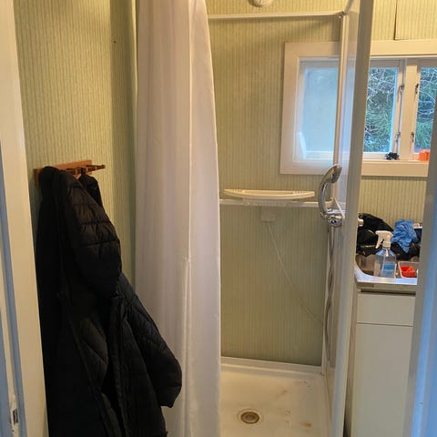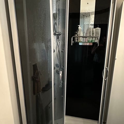 Duschkabin med glasdörrar och integrerad duschpanel