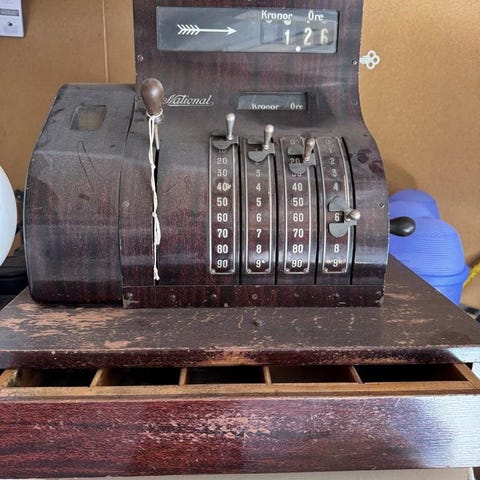 Sweda 7440 kassaapparat i metall med mekaniska knappar och rattar. En äldre modell av kassaapparat, tidigt 50 tal.