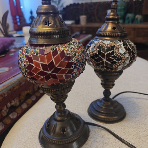3 fina bordslampor med fot i bok. Lampan inne i kupan är ett kompaktlysrör LED 7 watt.