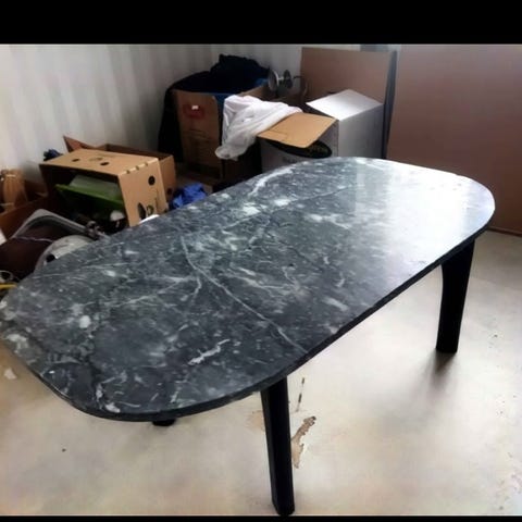 Soffbord med marmorskiva och underrede i trä. Skavanker finns, se bilder. Höjd 38 cm. Bredd 80cm, längd 140cm.