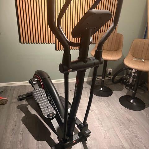 Crosstrainer träningsmaskin i svart färg. Utrustad för konditionsträning och helkroppsträning. Passar för hemmabruk och träningsövningar som kombinerar gång och löpning med armrörelser.