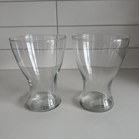 Tre glasvaser i gulbrunt glas. Setet består av en större vas och två mindre vaser. Vasernas design är enkel och rundad, lämplig för inredning och dekoration.
