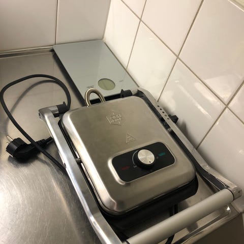 Elektrisk dubbel plattgrill i rostfritt stål med två oberoende grillytor. Utrustad med temperaturkontroller för varje sida, lämplig för matlagning av olika livsmedel samtidigt. Passar för kommersiellt eller hemmabruk.