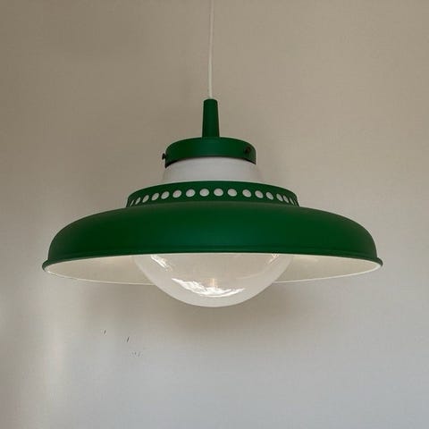 Gammal kökslampa med glaskupa el och ljushållare Mindre rostfläckar förekommer på metallkedjorna, hänger ner ca 110 cm kupan ca 30 cm x 25 cm