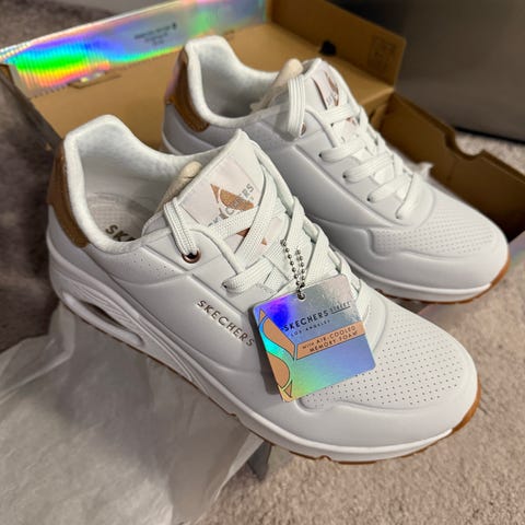 Skechers sneakers dam i storlek 39. Skorna är utformade för dam och har en stickad textilöverdel med snörning. Sulan är flexibel och ger stöd vid promenader och vardagsanvändning. Mjuka sköna och lätta. Använda endast en gång ca 3 timmar inomhus.