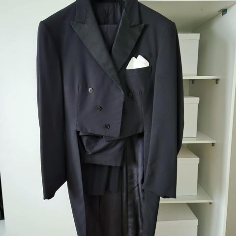 Aldrig använt av mej. Frack i mkt gott skick av gammal modell.Byxor med revär.Ngt lång för mej 178 cm. Västen trång på mej 90 kg. Fracken passar perfekt.