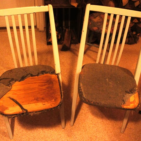 en svensk matstol i Karl Johan-stil från 1800-talet, möjligen tillverkad i mahogny eller mörkbetsad björk, med sabelben och en randig stoppad sits.